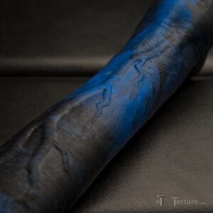 Below the glans the shaft is one straight, almost perfectly circular stem with a circumference of about 22cm. But its surface is heavily textured with shallow and several higher veins which run all over the place, both vertically and horizontally. At the back of the dildo, there runs a narrow and medium tall ventral groove. But when a vein intersects with it, taller standing bumps, like knots are formed. Even when just sliding the toy in and out, the sphincters are stimulated by the texture. As soon a start to twist and turn inside the hole, the intensity exponentially increases.