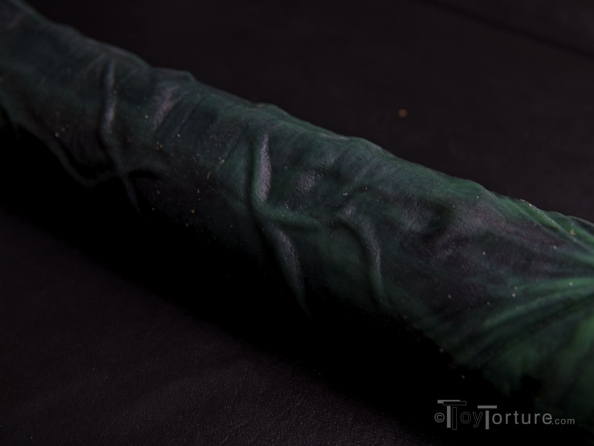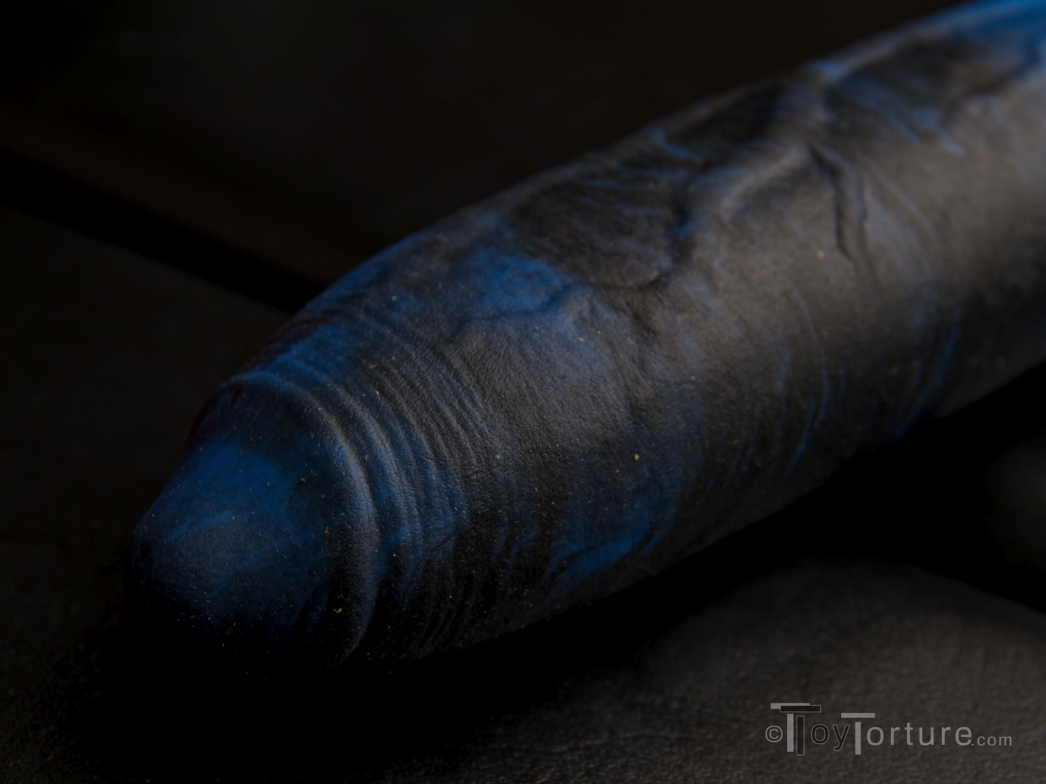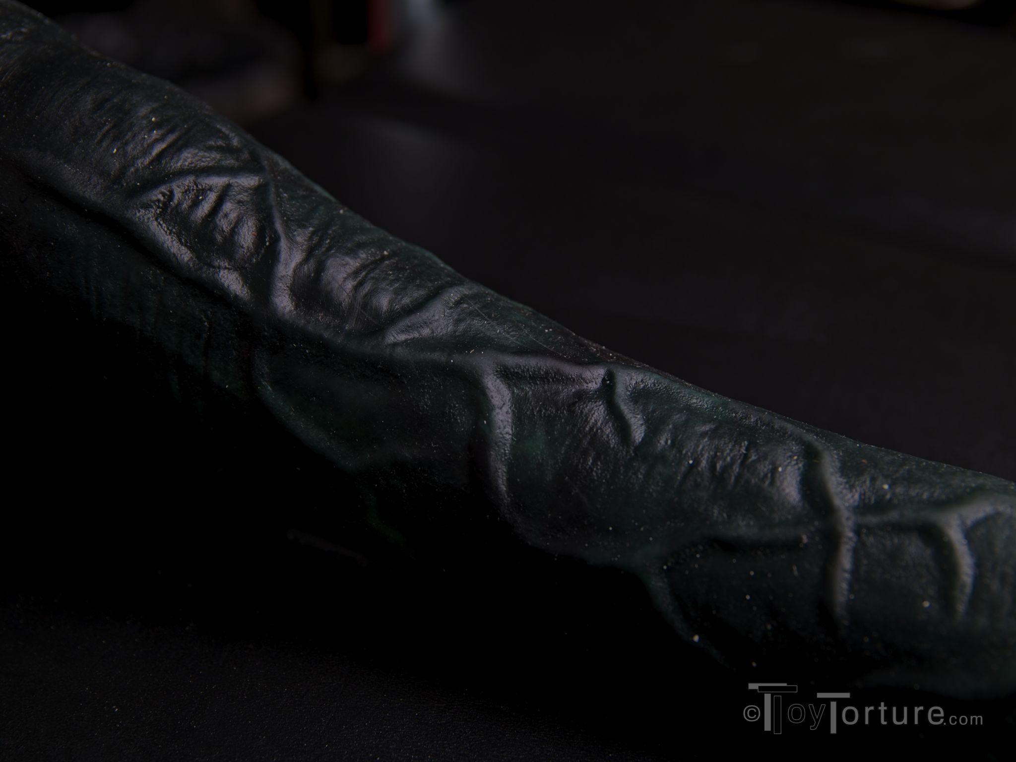 Below the glans the shaft is one straight, almost perfectly circular stem with a circumference of about 22cm. But its surface is heavily textured with shallow and several higher veins which run all over the place, both vertically and horizontally. At the back of the dildo, there runs a narrow and medium tall ventral groove. But when a vein intersects with it, taller standing bumps, like knots are formed. Even when just sliding the toy in and out, the sphincters are stimulated by the texture. As soon a start to twist and turn inside the hole, the intensity exponentially increases.
