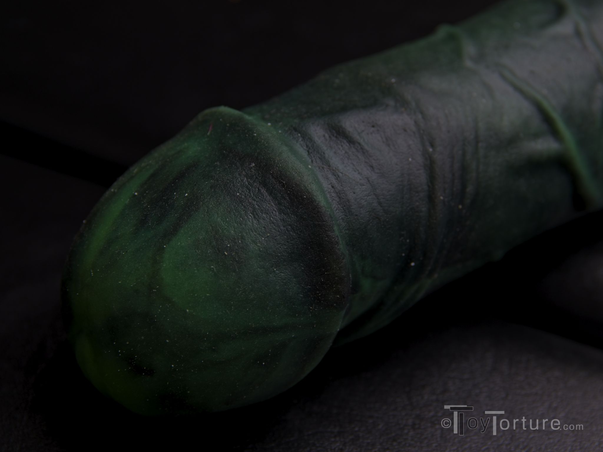 The tip of the glans tapers evenly and smoothly which could open the sphincter up easily. But it is textured with shallow bumps and ridges like weathered skin. So especially when you twist and turn the toy, it can irritate the sphincter a bit, making it a bit harder to open up. Like his human counterpart Jack Hunter is has been circumcised quite tightly. This in combination with the fat glans and thick glans rim leads to a big glans drop. Pushing the tip of his dick in, creates a noticeable POP.
