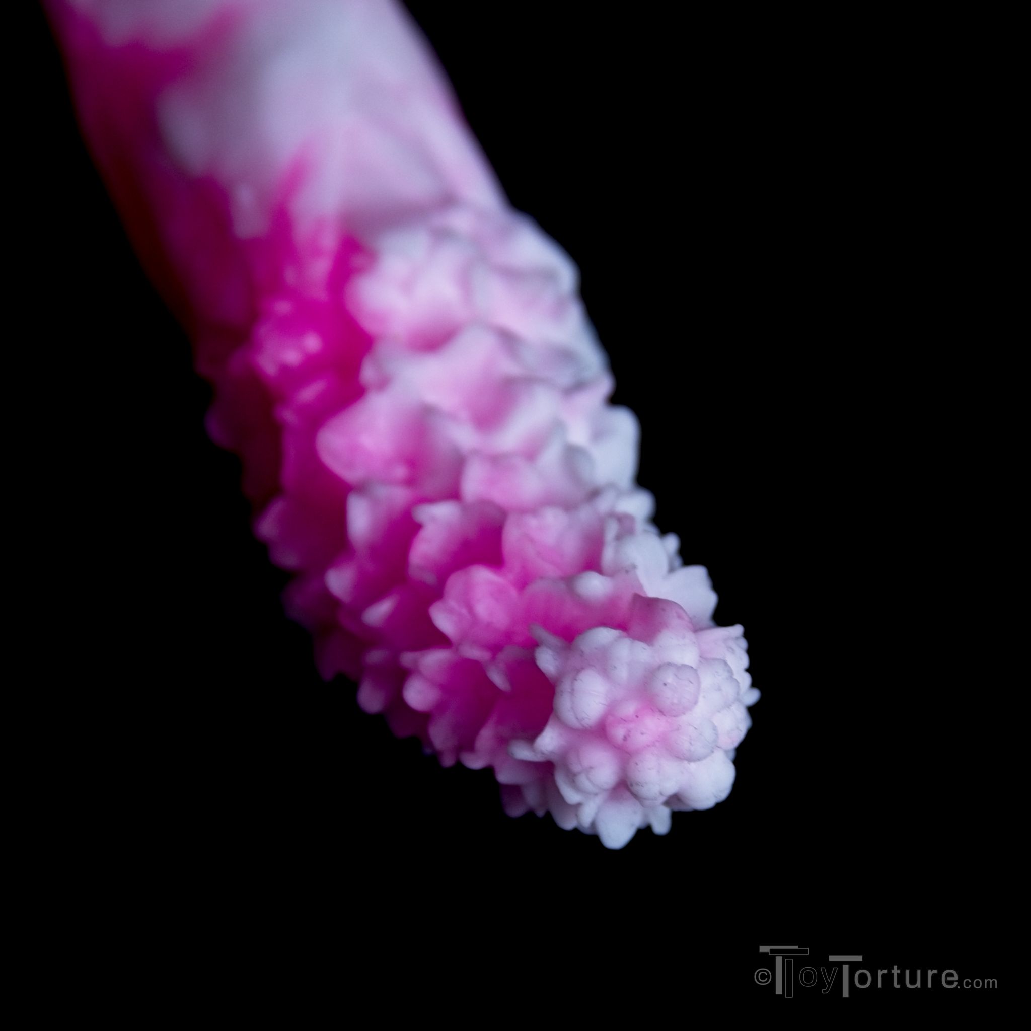 The highly textured tip is made for intense stimulations yet slow play. The cluster of cups in shape of the calyxes create tiny sucking vacuums and flexible blossom borders massage the surface. Slowly moving the toy, applying pressure and twisting it gently gives the texture the time to grip and release which creates the strongest feelings. Using the toy rapidly will give you the feeling of a slightly coarse yet even surface. The effect comes out the strongest at nerve-end rich body regions like the anus lips and prostate. According to my FtM testees, the upward curvature makes this toy especially good for targeting the g-spot when fucking. They also gave the tip good grades for clitoral stimulation.