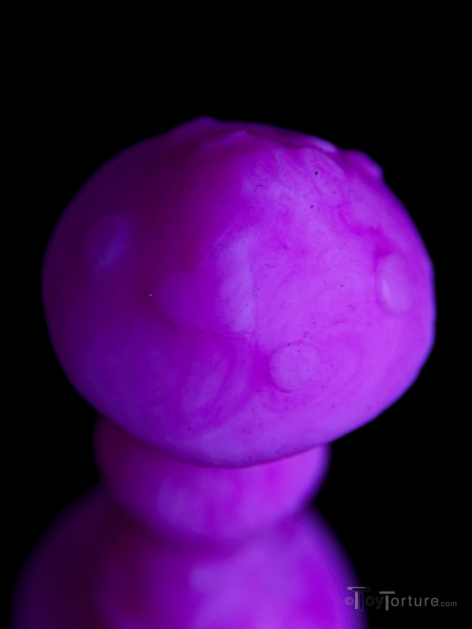 While the Lilac is a toy that plays with subtlety, the Shroomy is blunt: It is made for pressure stimulation, either on the prostate of the g-spot. The cone shape allows to grind and attack these sensitive areas precisely. One of my bi testees called the toy a “bottle opener” since handled correctly, it makes prostate fluids flow and front holes squirts. While the shallow dots on the top are a nice design feature, you do not really feel them. If you are not that stretched, the added friction makes taking the toy actually a bit more difficult. So the Shroomy is not a width training plug but made for welcoming and accommodating holes.