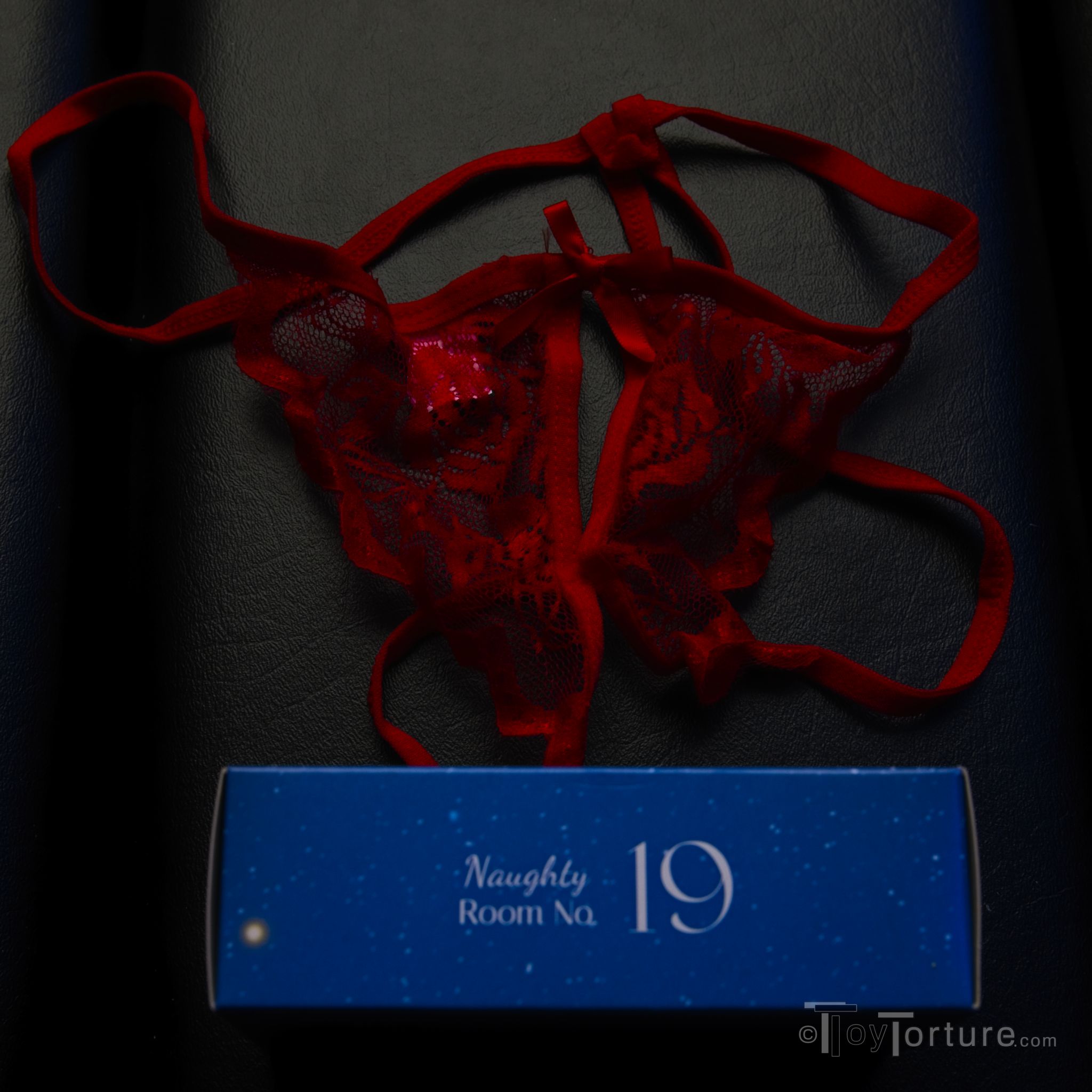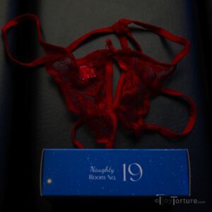 The theme of flimsy, cliché underwear continues. Now we are given a red piece of red lace with a slit in the middle, crowned by a boy. So apparently, you do not have to take the underwear of when playing with a front hole. But being again one-size-fits-all, I cannot imagine it fitting someone well. How much I would loved to have gotten more unscented lube instead of this cheap shit.