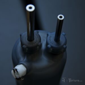 The last of the three poppers inducing tools is the Vaporizer. It is a lid with two female GM40 ports on top. The lead to different holes in the lid so there are distinct in and out ports depending on the layout. The lid screws onto the same 70mm diameter 250ml plastic can like the Vaporizer with Switch. The can comes with a lid so you can store whatever is inside once the scene is done.