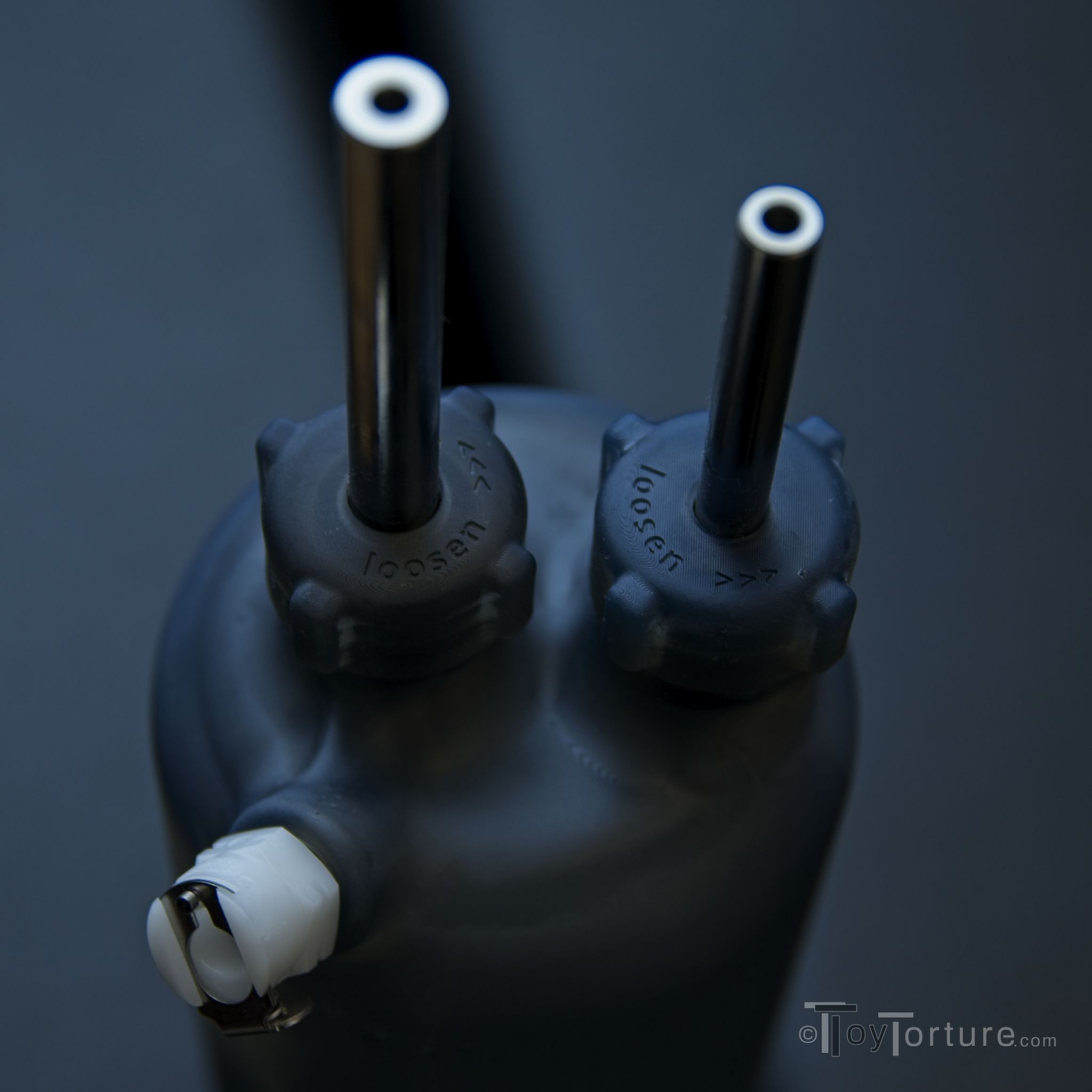 When playing with this bubble, a bit of care is necessary. Due to the chunk, heavy-duty gas mask ports on top, it is extremely head-heavy. Add to this the small footprint of the bottle and it can easily tip over, causing the piss to flow everywhere. My recommendation is to put it in a lube bottle holder to store it safely.