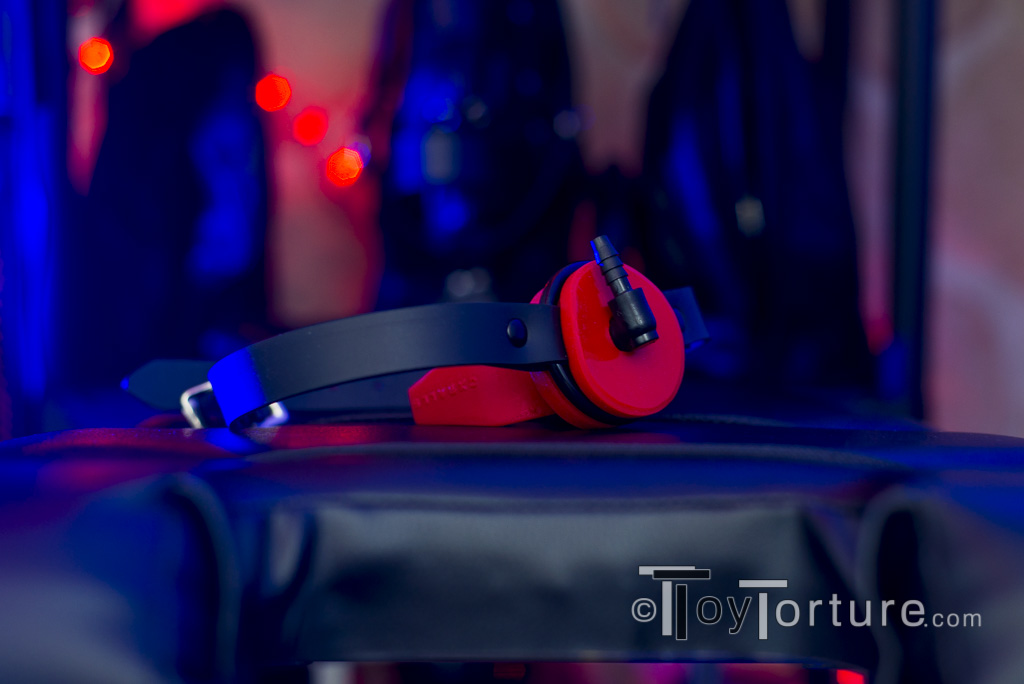 The gag is made out of two different kinds of silicone. The mouth-piece is made out of soft red platinum silicone. The front is a thick disk with 50mm diameter with a gap housing a black polymer ring. Onto this ring a strap out of sturdy black silicone is attached. It is 20mm wide and 600mm long. The edges of the strap are slightly deburred so they are comfortable to wear. Sadly it has not roller buckle which makes fasting it a bit complicated. This is annoying especially since you should not pull the silicone too rough in order not to damage it.