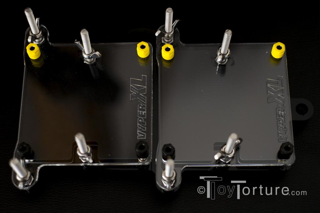 The basis of the Vyper is a rectangular piece of 8mm thick, black, polished plastic which measures 220x145mm. On top of this base plate two pairs of golden sheet electrodes are mounted, each sheet measuring 80x28mm. Using four 55mm long M6 screws a clear 110x110mm and 5mm thick plastic plate can be fixed on top of the base plate and tightened using butterfly nuts. There are two of these plates so the entire base plate can be covered. Depending on the bottom’s dick size, one or two places can be used to torment his dick. At the bottom of the clear plates, the same electrode layout as on the base plate can be found.